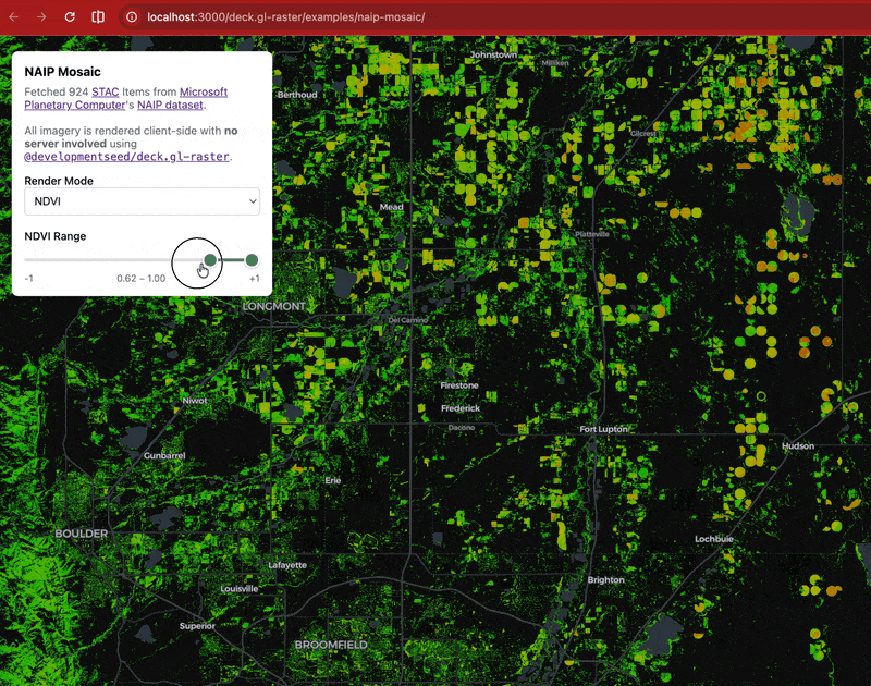 We've updated the example to also enable GPU-based filtering. Drag the slider to control what values of NDVI are displayed. This updates extremely fast because it's all on the GPU.