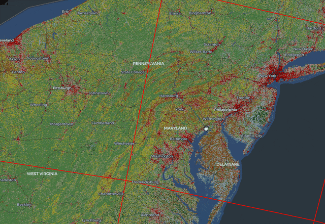 In this screenshot of the NLCD Land Cover example, you can see the lower-resolution data is still rendered while waiting for the higher resolution data to load. (The red rectangular outlines are the boundaries of the COG tiles)