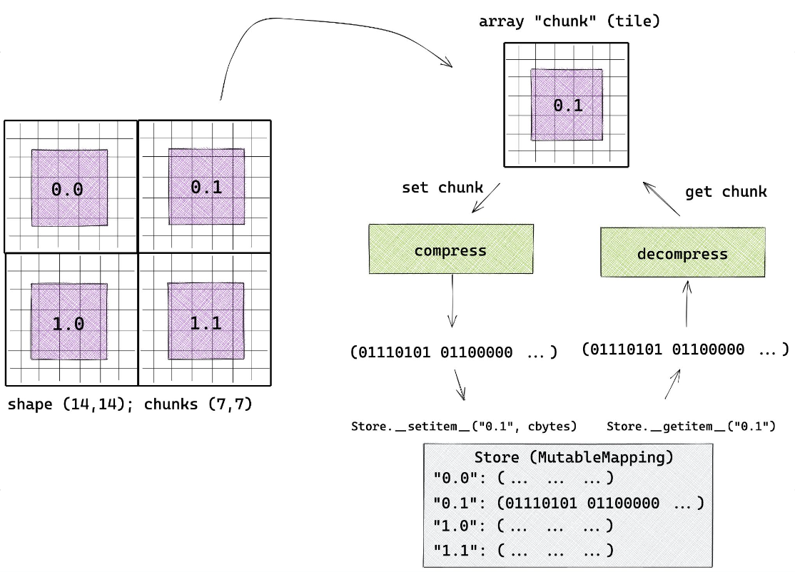 Zarr is a format for the storage of chunked, compressed, N-dimensional arrays. It is ideal for large-scale, multi-dimensional datasets, such as weather data, climate models, and hyperspectral imagery.