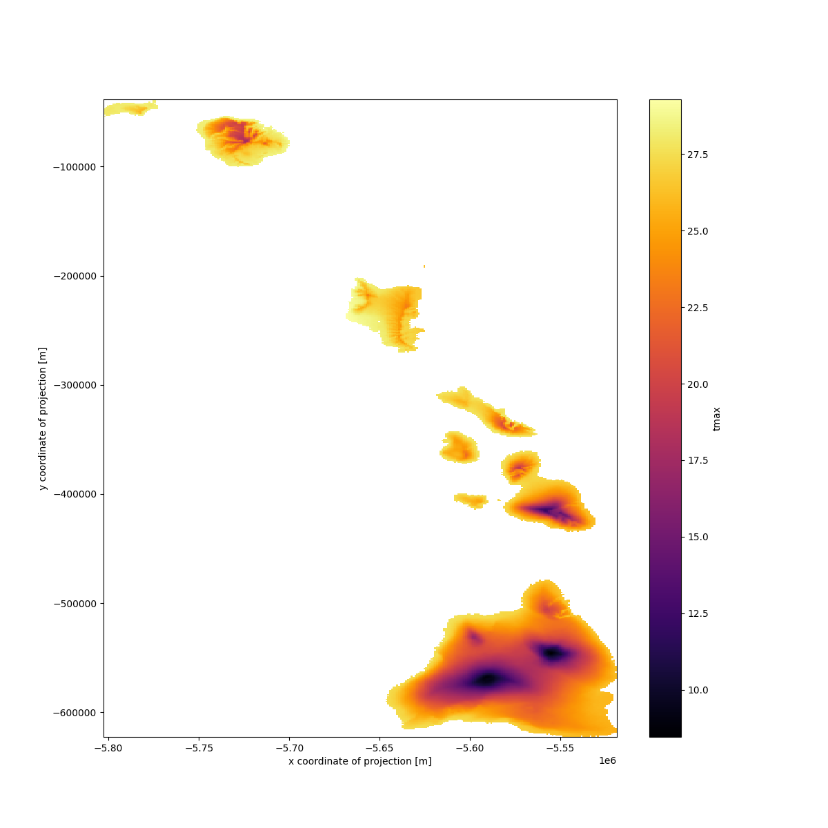 ds.sel(time="2009")["tmax"].mean(dim="time").plot.imshow(ax=ax, cmap="inferno")